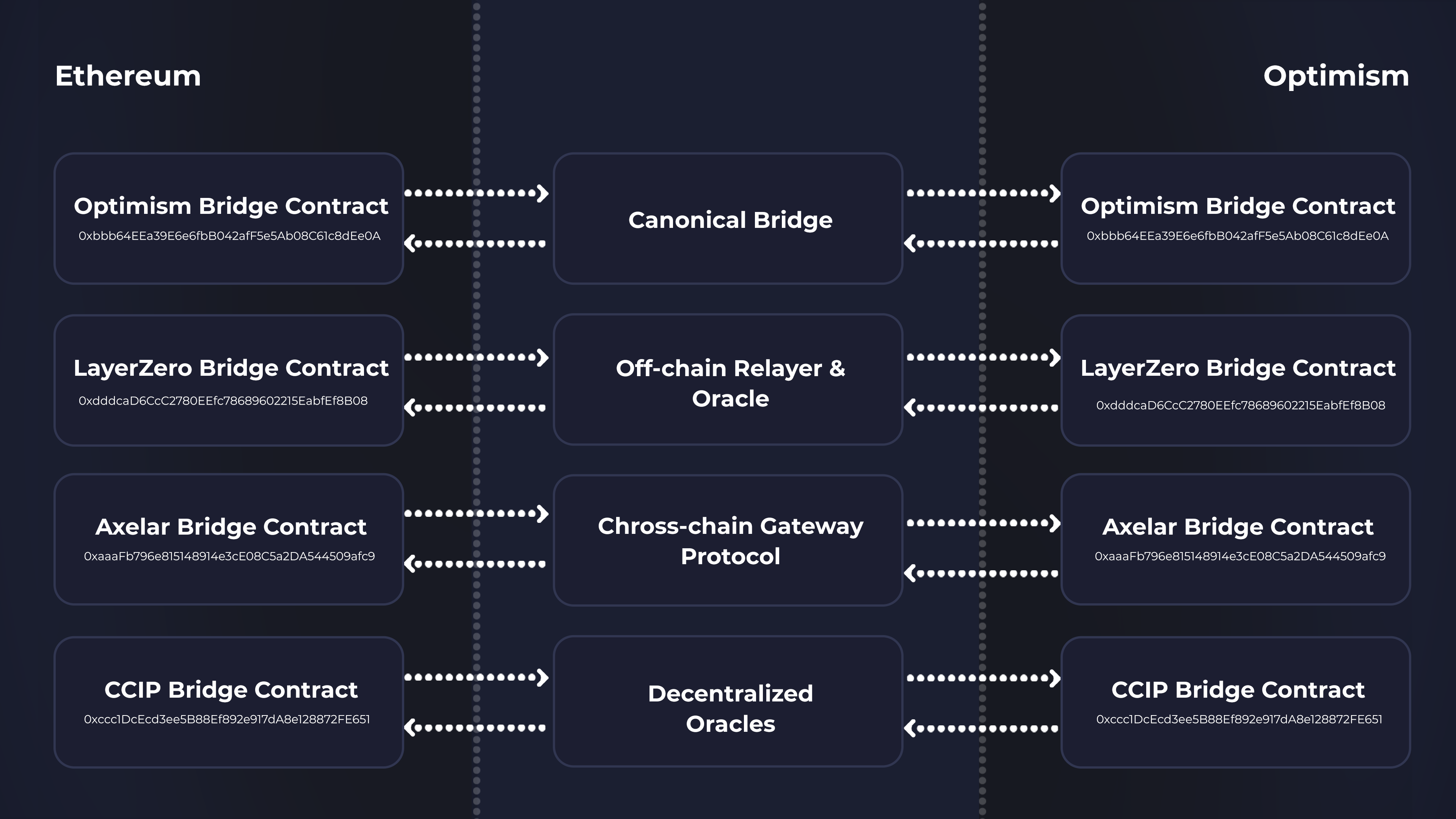 <figure><img src="https://3342042426-files.gitbook.io/~/files/v0/b/gitbook-x-prod.appspot.com/o/spaces%2F-MJZ0tXJc-hdgL-YTlPk-887967055%2Fuploads%2FFXLYfhHqZGaP7OxxYmVq%2FBIFI-bridge-providers-flowchart-clean.png?alt=media&#x26;token=3469c349-461a-409a-a2a8-0e23f8aac1bc" alt=""><figcaption><p>A flowchart showing the 4 bridge contract pairs on Ethereum and Optimism on launch.</p></figcaption></figure>